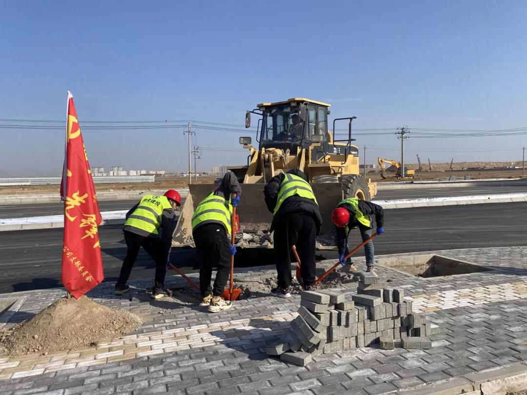 全體黨員、積極分子、入黨申請人發(fā)揮模范帶頭作用,主動請纓,接替勞務(wù)工人崗位工作。不到半日,項(xiàng)目部便成立起一支28人組成的黨員先鋒隊(duì),第一時間投入到項(xiàng)目一線建設(shè)工作中。路燈電桿材料裝卸、交安工程基礎(chǔ)廢料清理、道路中水管道橫穿、人行道面包磚鋪設(shè),各作業(yè)面恢復(fù)了往日施工大干的忙碌場景。
