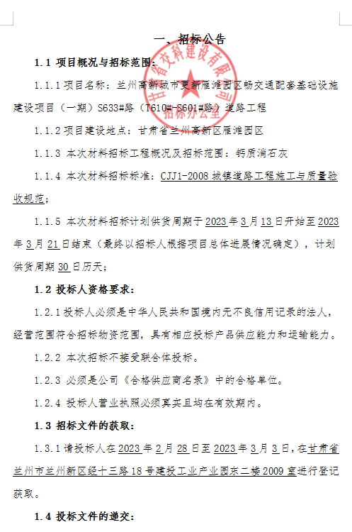 蘭州高新城市更新雁灘園區(qū)暢交通配套基礎設施建設項目(一期)S633#路(T610#-S601#路)道路工程材料招標公告