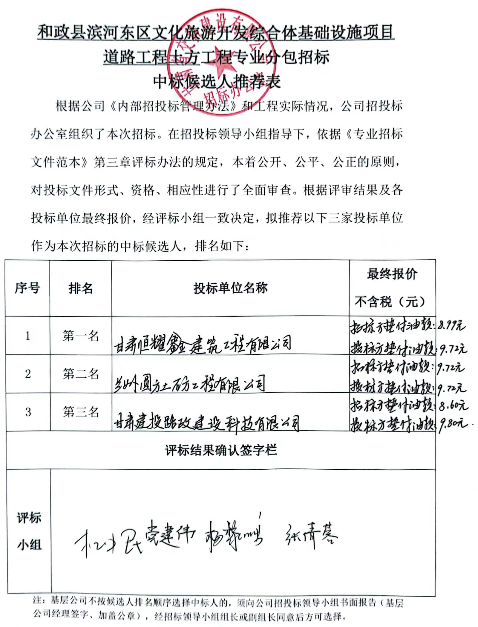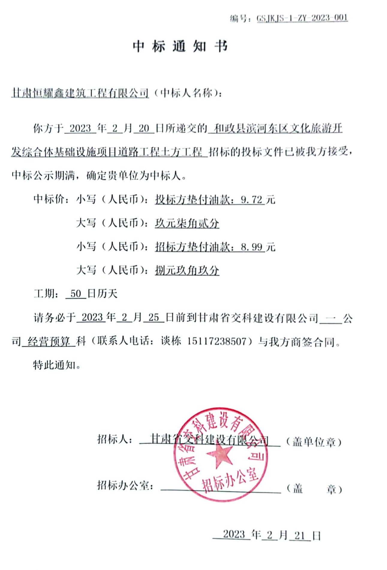 和政縣濱河?xùn)|區(qū)文化旅游開發(fā)綜合體基礎(chǔ)設(shè)施項(xiàng)目道路工程土方工程中標(biāo)候選人及中標(biāo)通知書