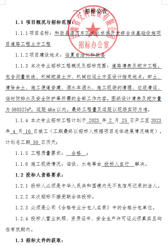 和政縣濱河?xùn)|區(qū)文化旅游開發(fā)綜合體基礎(chǔ)設(shè)施項目道路工程土方工程招標