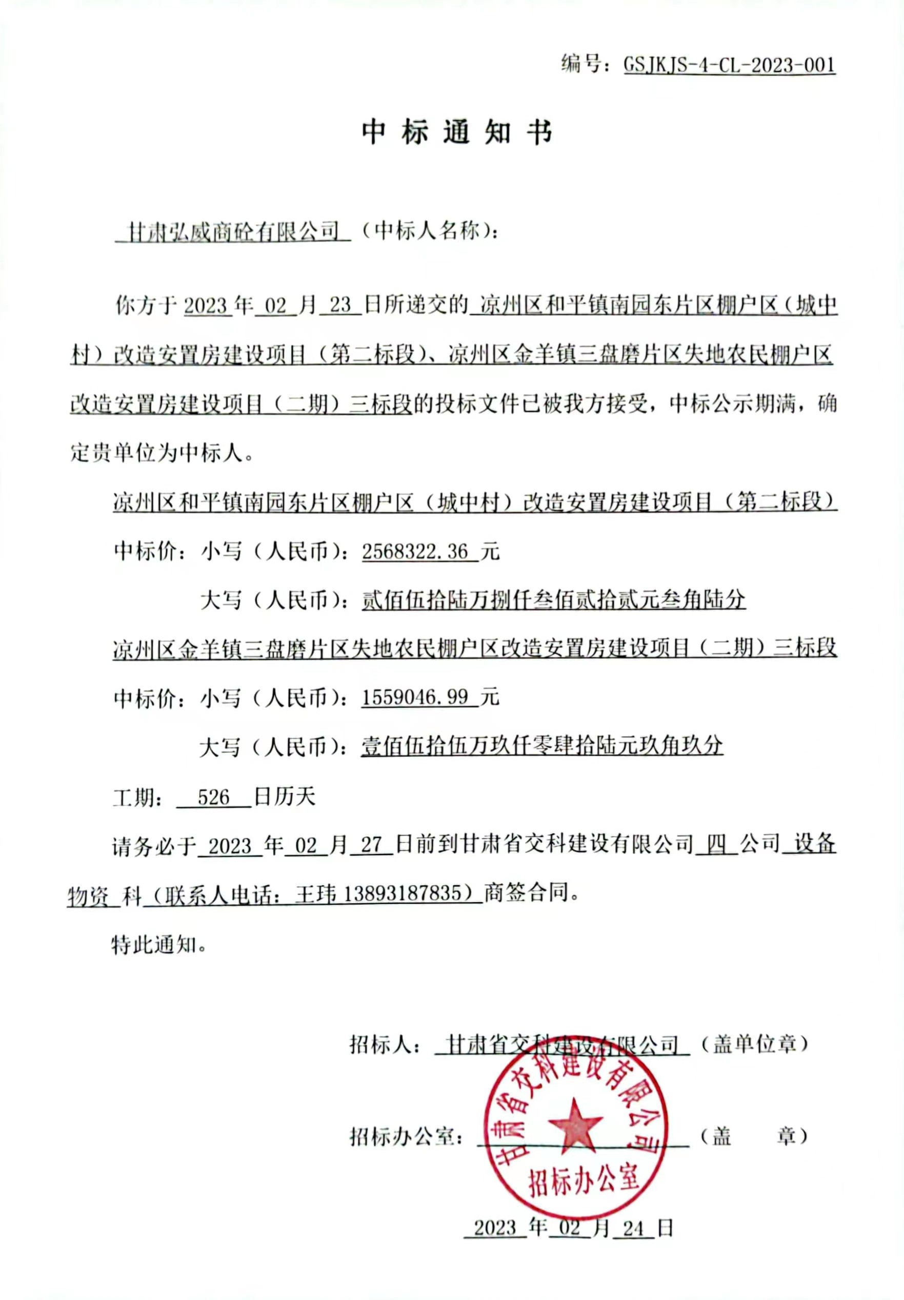 涼州區(qū)和平鎮(zhèn)南園東片區(qū)棚戶區(qū)(城中村)改造安置房建設(shè)項目(第二標(biāo)段) 涼州區(qū)金羊鎮(zhèn)三盤磨片區(qū)失地農(nóng)民棚戶區(qū)改造安置房建設(shè)項目(二期)三標(biāo)段中標(biāo)候選人及中標(biāo)通知書
