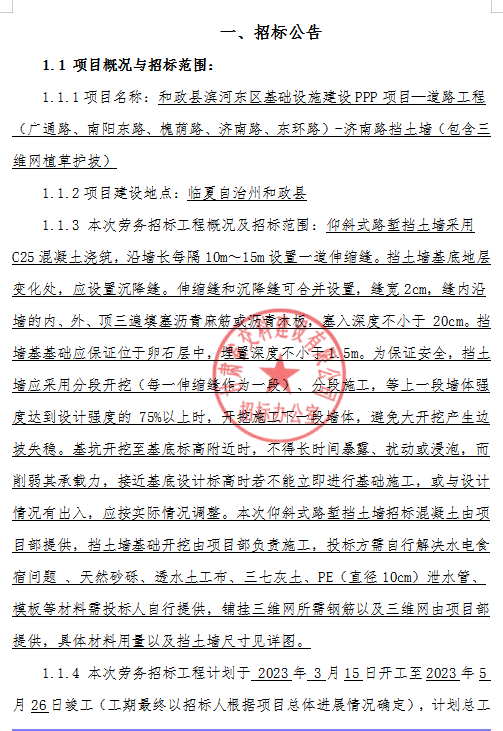 和政縣濱河?xùn)|區(qū)基礎(chǔ)設(shè)施建設(shè)PPP項(xiàng)目—道路工程(廣通路、南陽(yáng)東路、槐蔭路、濟(jì)南路、東環(huán)路)-濟(jì)南路擋土墻(包含三維網(wǎng)植草護(hù)坡)招標(biāo)公告