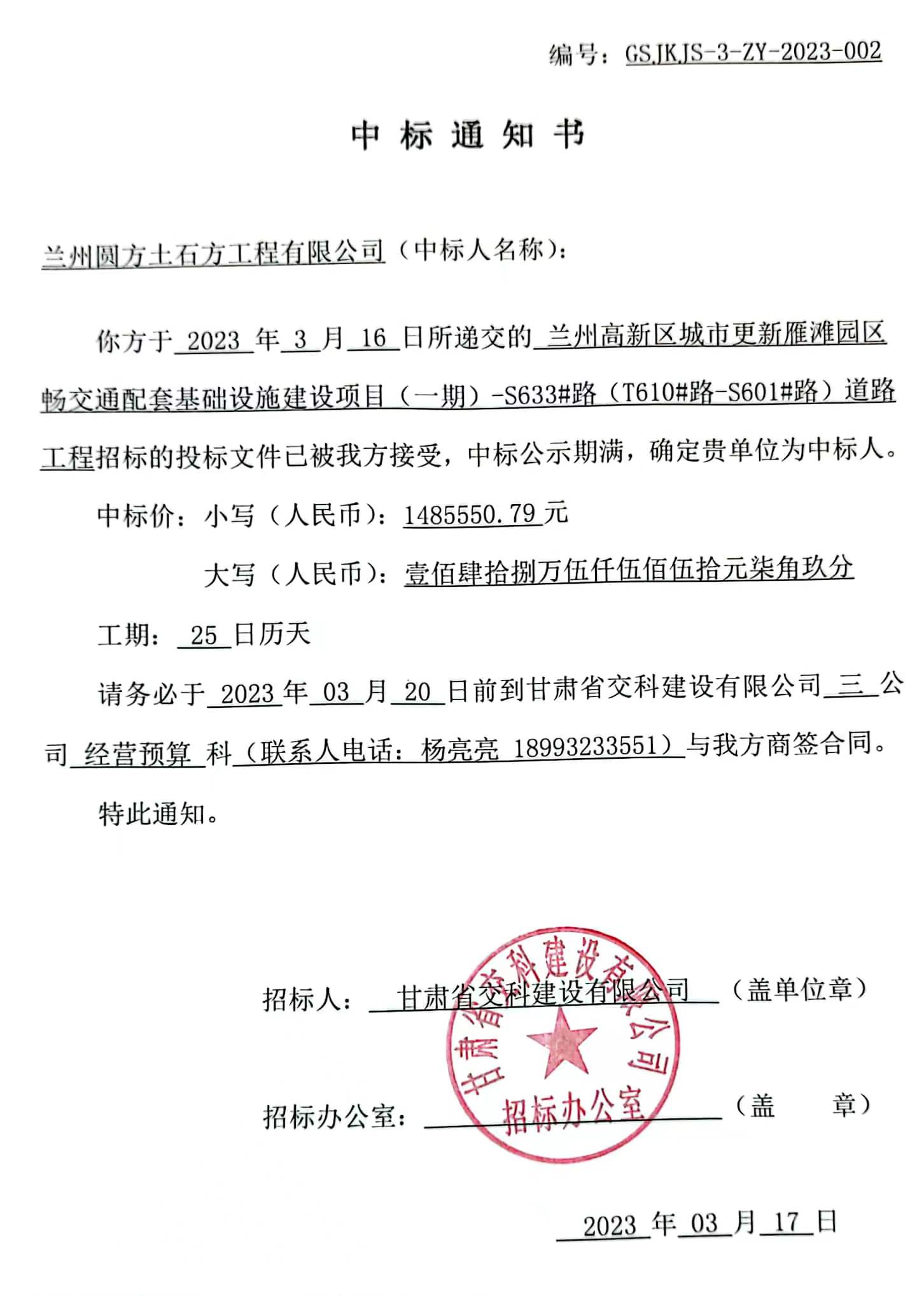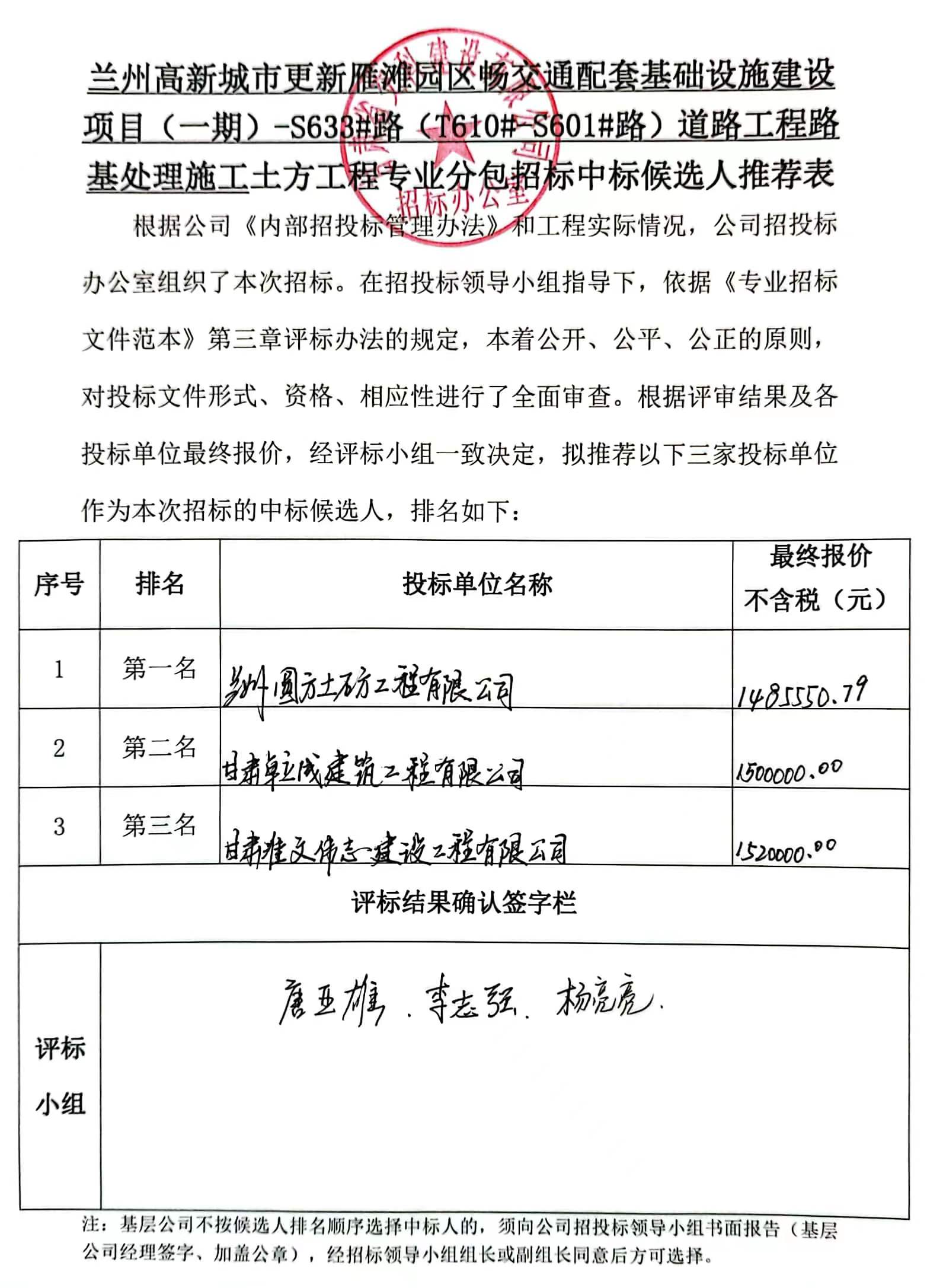 蘭州高新城市更新雁灘園區(qū)暢交通配套基礎(chǔ)設(shè)施建設(shè)項(xiàng)目(一期)-S633#路(T610#-S601#路)道路工程路基處理施工中標(biāo)候選人及中標(biāo)通知書