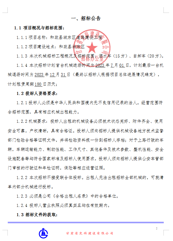 和政縣城東區(qū)道路建設(shè)工程-機(jī)械租賃招標(biāo)公告