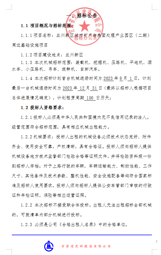 蘭州新區(qū)城市礦產(chǎn)與表面處理產(chǎn)業(yè)園區(qū) (二期)周邊基礎(chǔ)設(shè)施項目-機械租賃招標公告
