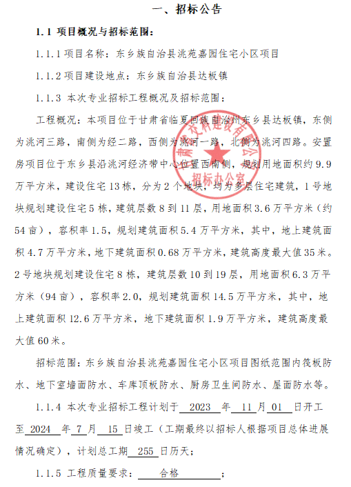 東鄉(xiāng)族自治縣洮苑嘉園住宅小區(qū)項(xiàng)目專(zhuān)業(yè)分包招標(biāo)公告
