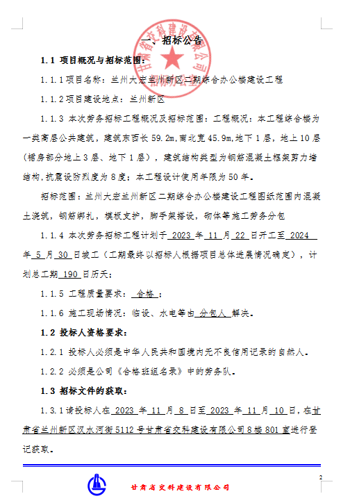 蘭州大宏蘭州新區(qū)二期綜合辦公樓 建設(shè)工程勞務(wù)分包-招標(biāo)公告