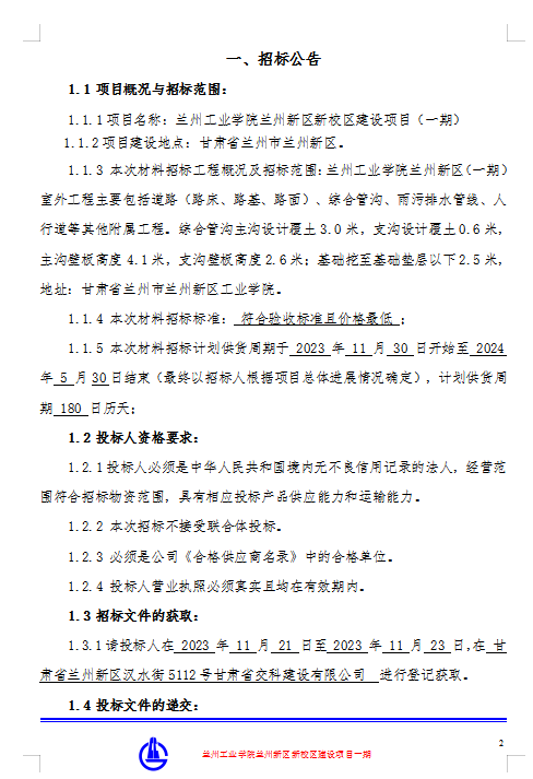 蘭州工業(yè)學(xué)院蘭州新區(qū)新校區(qū)建設(shè)項目(一期)--材料招標(biāo)公告