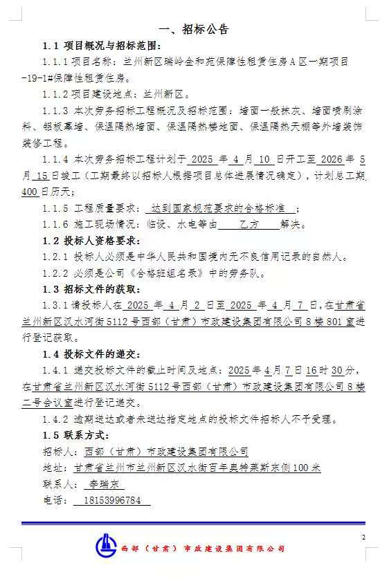 蘭州新區(qū)瑞嶺金和苑保障性租賃住房A區(qū)一期項目-19#-1#保障租賃住房-墻面一般抹灰等勞務(wù)分包招標公告