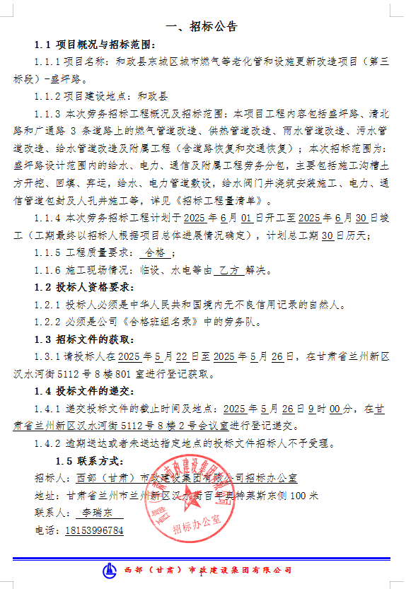 和政縣東城區(qū)城市燃?xì)獾壤匣芎驮O(shè)施更新改造項目(第三標(biāo)段)-盛坪路-勞務(wù)招標(biāo)公告