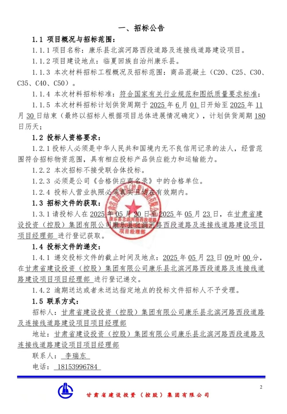 康樂縣北濱河路西段道路及連接線道路建設(shè)項目-商品混凝土-招標(biāo)公告
