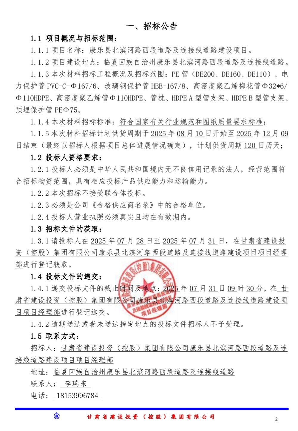 康樂縣北濱河路西段道路及連接線道路建設(shè)項目-材料招標(biāo)-招標(biāo)公告