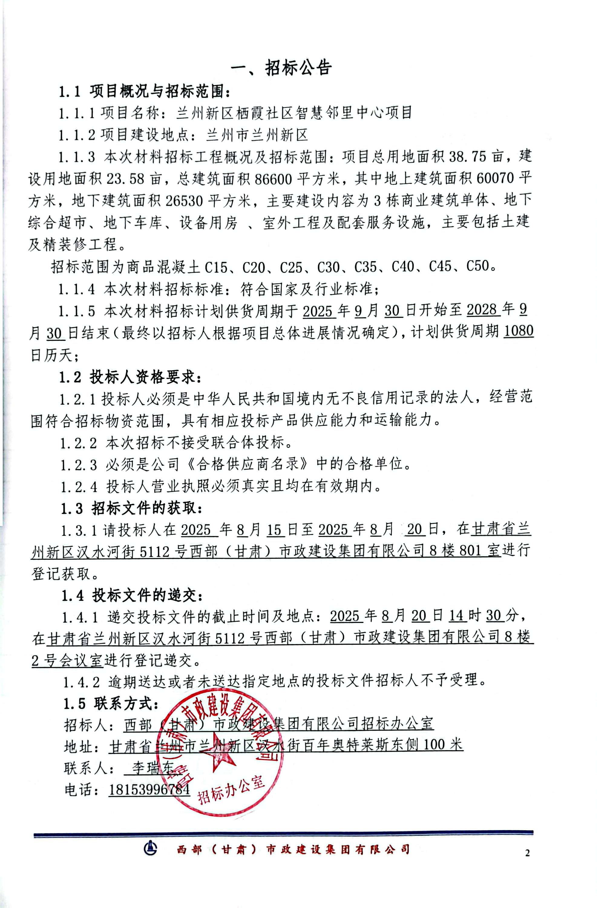 蘭州新區(qū)棲霞社區(qū)智慧鄰里中心項目-商品混凝土-招標公告