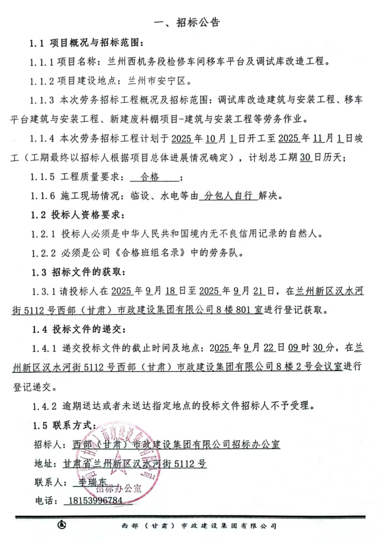 蘭州西機(jī)務(wù)段檢修車間移車平臺(tái)及調(diào)試庫改造工程-勞務(wù)分包招標(biāo)公告
